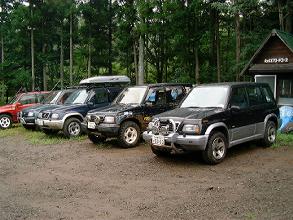 エスクミとしては初めてのオフロードコース走行を取り入れ、エスクードの底力を見せつけ・・・る前に、まず幹事が自ら泥の罠に。MTタイヤを装備しての果敢さもむなしく、白いエスクードは水遊びをするサイと化していきます。私のクルマなんかもっと惨めで、コースの入り口で轍にとられてお話にもならない(デジタル写真を撮ってもらったのですが、幸か不幸かシャッターが切れていなかった・・・ほ、ほんとですよっ)。