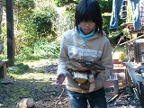 しかし習っている間の顔つきは真剣そのもの。腕力も足りないので、最初の30分はへなちょこで、鉞なんかかすりもしないのだけれど、ある一瞬でこつがわかると、まだ生木の栗の幹はカコーンとまっぷたつになる。