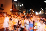 実際に練り歩く行燈を見て感心したのは、ねぶたであり、行燈であるという制作条件を熟知して描かれた絵と、色彩であったこと。かぐや姫の十二単やら竹林やら窓辺の月やら、200m離れた遠目にも識別できる図柄と発色。これは美術部の顧問の先生が上手に指導した成果でしょう。現地では顧問の先生が、