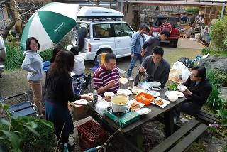 基地の自慢である杏子の満開には間に合いませんでしたが、レンギョウ、紅唐子、雪柳などはピーク。作業を完了したSKETTO一同は、午後はまったりと花見に移行し、なかなか豪華版の昼食を楽しむのでした。そういえばこの日、新シリーズが放送開始された「鋼の錬金術師」にも、じゅんきちさんの作ったものと全く同じキッシュが登場していましたよ。