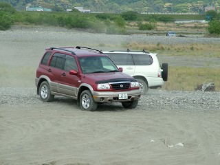 2代目エスクードが沢山参加しています。河川敷の砂が堆積した土手をステージに、各位登ったり降りたり。一番果敢だったのは、ローダウン仕様のマーティー。さんによるアタック。それを見てしまった弾丸ローダウンのkawaさんも挑みます。よっしーさんのGエスクードも、手作りの足まわり延長キットで悠然とした走り。akiさんとsugiさんの3代目も余裕の性能で、会うたびにSUVの領域を脱して逞しくなっています。