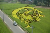 秋の旅では見ることのできなかった景色。それを、ふと眺めたくなった。 水田に貼り絵をしたような、風神と雷神。数種類の稲を植え分けることで描いたものだという。
