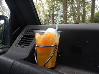 店主と歓談させていただき、時々仕事を放り出してコーヒーブレイクに来ますと席を立つ。 すると、移動販売のキッチンカーが出ていた。 売り出している人気商品はベーコン串だというのでこれを注文し待っている間、「夏みかんたっぷりの贅沢クリームソーダ」を見つけた。 「これも人気ですよ。濃厚なので試してみてください」 カフェの店主よりもさらに若い店主がにこにこしながら勧めてくれるので、追加でお願いする。季節や行楽状況を見ながら県内各地を走り回るというので、天狗の森で再び出逢えるのがいつになるかは定かでない。 しかしこの夏みかんのクリームソーダも確かにうまい。ベーコン串はなかなかの肉厚でやわらかい。できればここには頻繁に来てほしいと思う。 流行なのかもしれないが、ここにも青いクリームソーダがある。緑のやつにはメガサイズもある。次回ここで店を開いてくれていたら、そちらも頼んでみよう。 森はすっかり新緑の様相になっている。帰路は舗装林道で山下りをしたが、程よく荒れてきていて、手入れされなくてもいいんだけどなあとほくそ笑んだ。 |