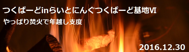 今回の参加者 かわねこさん AMGさん 狼駄さん SIDEKICKさん コムロさん 新月さん&風花さん TA01Wさん S.Doさん 雷蔵、れいん 霰、霙 ことし開いたつくばーどイベントの実に4回が基地で行われているという堕落の極みの2016年。本当は「らいとんにぐ鵠沼」のチャンスがあったのだが、まさかそんなところに誰もいないだろうと声をかけなかったのが間違いで、かなり至近距離に和邇さんがいたことが後になって判明した。 まあその話は置いておき、ことしも1年の締めくくりのように、かわねこさんが北海道から越冬・・・じゃなくて帰省してきた。 これを出迎えるべく、認肉屋のハンバーグ系夜会を設営し、二次会は基地において焚火という段取りを準備した。 余談だが認肉屋のハンバーグやステーキは、よそに行く必要などないほど美味い。そしてこの時期、月のない夜には満天の星座。寒いと言っても逆転層の中で程度問題。そして基地では防災対策を講じたうえでならば直火で火を焚ける。 これだもの、自堕落になっちゃうのである。 ただし最近の基地周辺はイノシシが闊歩しているため、火を離れて薪置き場に薪を取りに行くのはちょっとスリルがある。 実際僕とかわねこさんは、姿は見えなかったが「奴らの声」と遭遇した。 今回はAMGさんが昨年同様臼と杵でついた出来立ての餅をはじめブロックのハムやらベーコンやらチャーシューやらを振る舞い、参加者それぞれがつまみを持ち寄り、なぜか酪農と農機具の話で盛り上がった。 「これなら次は、一次会からここで煮炊きをしてもいいですよねえ」 「いっそ去年みたいにこれを忘年会として定着させればいいのでは」 との声も上がる。いや全然かまわないです、自堕落の上に他力本願を重ねるだけのこと。というか、つまりそれは来年の開催も決定ということ? |