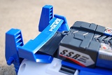 トミカタウンの警察機構精鋭部隊・ハイパーブルーポリスは、機動パトロール車・ソニックランナーのパワーアップ計画に乗りだした。 白と青のカラーリングを逆転させ、ポップアップ式であったブーストユニットをルーフ後部に固定式へと変更した。これはブースターの可動機構を廃し、車体内スペースに新たな駆動輪を内蔵するためだ。 スーパーソニックランナーと名付けられたニューモデルは、これまで移動基地然としていた前モデルに「追跡モード」を付加し、追跡加速時の安定性と速度維持のために、同モード時には6輪駆動へと変形、車体ごとホイルベースを後方に延長することができる。例によってエンジン形式と排気量、出力スペックは秘匿されたままだが、最高速度は420km/hに引き上げられた。 ソニックランナーに対して、重量は96tから90tに軽量化された。左右のガルウイング・ベイを廃止し、小型車両搭載数を減らしている。また、ノーマルモードでの全長こそ17.8m(旧モデル17.4m)に延長されたが、全幅は7.5m(同8.3m)、全高も5.5m(同6.8m)と、スリム化とローダウンしている。 新たな装備としては、車体後部のスモークランチャーが追加された。この手の車両にスモークランチャーを装備する理由は理解できないが、暴動鎮圧任務も範疇だとすれば、催涙弾などの発射も可能と思われる。このランチャーは、追跡モードにおいてはリアフェンダーへ移動させることもできるが、気になることは前方、後方とも水平射出体勢を取っていることだ。催涙弾頭などの水平発射には殺傷能力が示唆されるため、物議を醸すのではないか? このほか、同時期にモデルチェンジしたハイパーレスキュー1、2号U型の放水銃やフレキシブルラダーを供用でき、それらのアタッチメント用ハードポイントをリアフェンダー上に備えている。 |