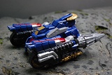 レスキュードリルは、地中用救助マシンとして開発されたものだが、掘削用アタッチメントに円錐型超硬質ドリルを採用した独創的な車両だ。全長約10m(全幅6m、全高3m)の車体寸法は、ドリル先端から後部排気筒までの駆動系モジュールの全長数値で、動力・操縦系をまとめた本体ブロックは、レスキューショベルと共通のユニットをベースに、操縦系に専用モジュールを組み合わせている。操縦系モジュール後部には大型ディスクカッターも装備される。 駆動系モジュールは左右を入れ替え、前後を逆に組み付けることで、破砕用ローダーを前面に繰り出すクラッシュローダーモードとして活用できるなど、モジュールの応用に富んだ設計となっている。ただし、連結ポイントの位置とドリルの寸法から、レスキューストライカーに連結出来るのはドリルモードのみである。また、各モジュールは他のレスキュービークル(RV)にも連結可能だ。 文字通り、地中の超災害被災者を救助する装備だが、RVシリーズが配備されたのがいつからなのかに興味を持たせる「いよいよ」という会話がなされている。現在のレスキューフォースは第2期生。隊長・石黒鋭二がルーキーだった頃には、RVの全ては完成していなかったかもしれない。なお、レスキューストライカーとの連結モード・ドリルストライカーでは、ドリルブーストという突撃型ファイナルレスキューを発動する。 |