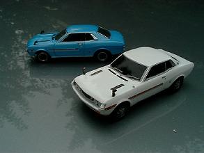 《TOYOTAセリカ1600GT》 本格スポーツならスポーツカー専業メーカー岡村製作所(後にスチール家具からオフィス機器メーカーに)のミカサシリーズ、本田技研のS500/600/800,これらに触発されて日産系の下請けが奮起した住江製作所フライングフェザー、そして日産本体のフェアレディーといった昭和30年代スポーツが先鞭ですね。そして4名以上乗車できるものとして、いすずベレット、そして日産と旧プリンスさらにヤマハ発動機3社の合作のスカイラインがヘビー級スペシャリティー(?)として登場しますが、なにしろ高価。そしてテンロクスペシャリティーのセリカ登場ですね。誰が付けたかニックネームの「ダルマ」は定着しました。シャーシや足回りは「足のいいやつカリーナ」と共通、そしてエンジンは得意のヤマハ製DOHC。トヨタ、ヤマハ提携第一弾のトヨタ2000GTが、当時あまりにも高価で、セリカは庶民向けヤマハスポーツとして開発されました。 この”だるま”ラインでは、デビュー1年前の昭和44年モーターショーで「EX−1」という名前でお目見えしています。そして昭和45年12月、初代セリカは次のようなエンジンバリエーションで市販開始となりました。 T型1407CCの86PS/6,000rpm、 2T型1588CCの100PS/6,000rpm、 2TB型1588CCの105PS/6,000rpm、 2TG型1588CC−DOHCの115PS/6,400rpm |