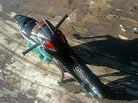 | 《バトルホッパーの 進化》バトルホッパーと共に活用されたのがロードセクター。プラズマイオンエンジンは1500馬力を越え、時速960kmをマークするモンスターマシンです。大門洋一博士がゴルゴムに 文明破壊用兵器として開発させられたもので、博士の息子・明からBLACKに託されました。 バトルホッパーを上回る出力とスピードはオンロードでの追跡や、一撃離脱戦に多用されました。時速800kmを越えると、フロントカウルからテールにかけてアタックシールドが張られ、同時に発生するイオンバリヤーが空気の摩擦や敵の攻撃からライダーとマシンを防御します。水中航行、無人走行も可能。 |