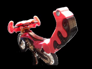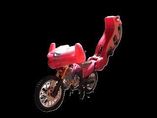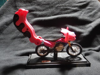 ならば商品化される前に作るぜ。と、ブルキャンバギーをもう一台手に入れ、車体を分解した。問題はコアとなるオフロードバイクの方で、適当なものを探すとホンダCRF450Rが出ている(劇中車は250)。さてこれで頭と尻尾を括り付ければカンタン・・・